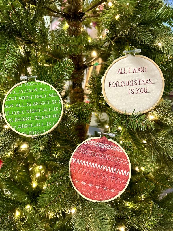 During December, we’re giving away FREE ornament project kits to every Open Studio attendee. These ornament projects feature a wooden embroidery hoop and festive designs inside. You can PLAY with the decorative stitches on your sewing machine to customize the design to your liking; when you’re done, hang it up on your tree and make it a permanent part of your ornament collection!